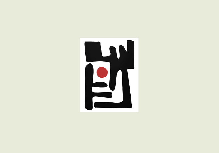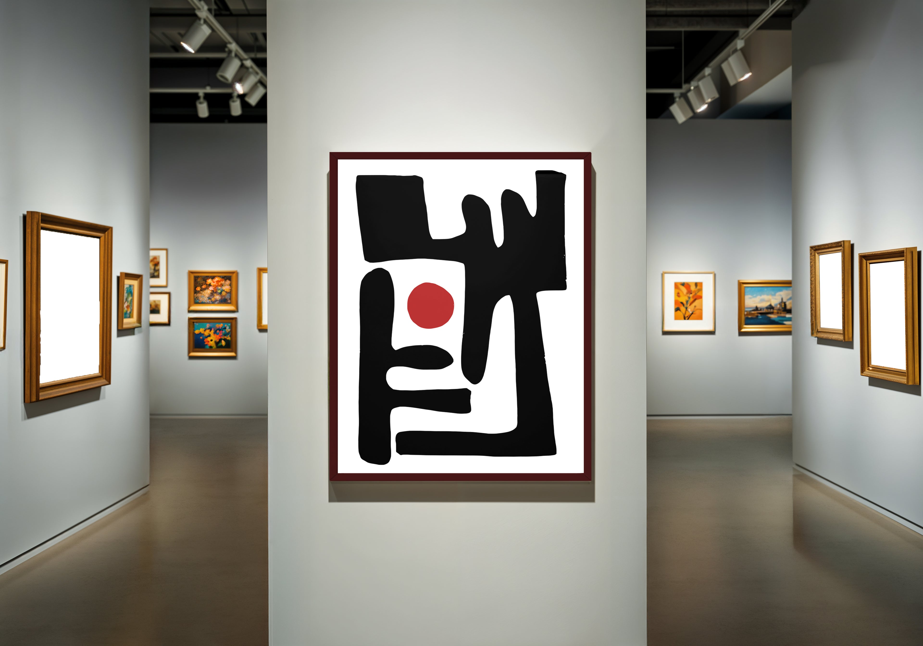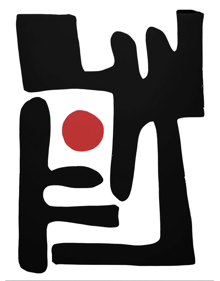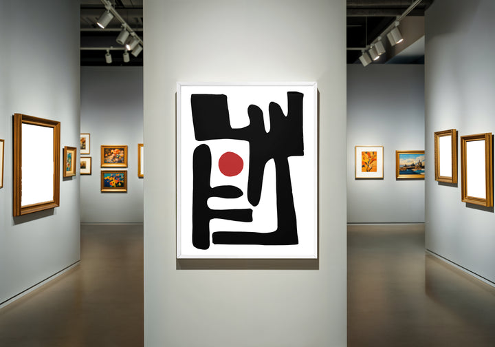 A striking exploration of shape and emptiness, “Eclipse of Form” centers a vivid red orb surrounded by bold, architectural strokes. The composition feels like a modern ritual where simplicity becomes profound, and balance emerges from abstraction.
