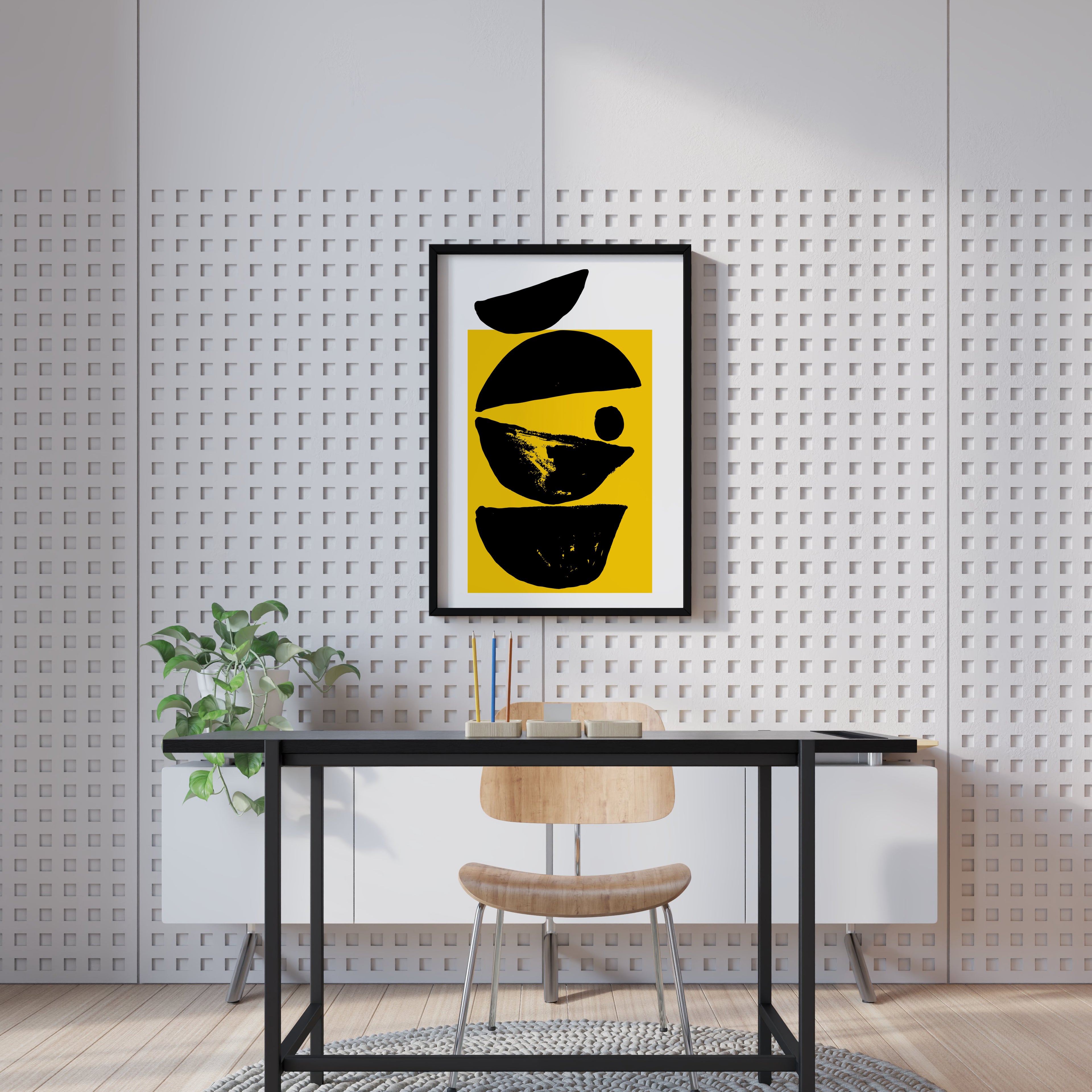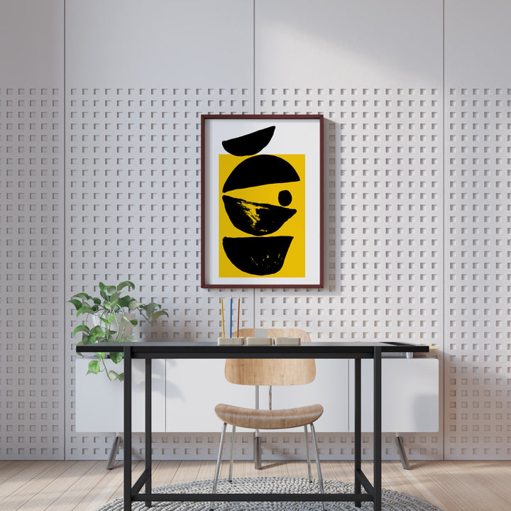 Solar Balance captures the harmony between light and form through bold geometric shapes and a striking yellow backdrop. The layered black elements create a sense of movement and depth, symbolizing energy, focus, and creative equilibrium.